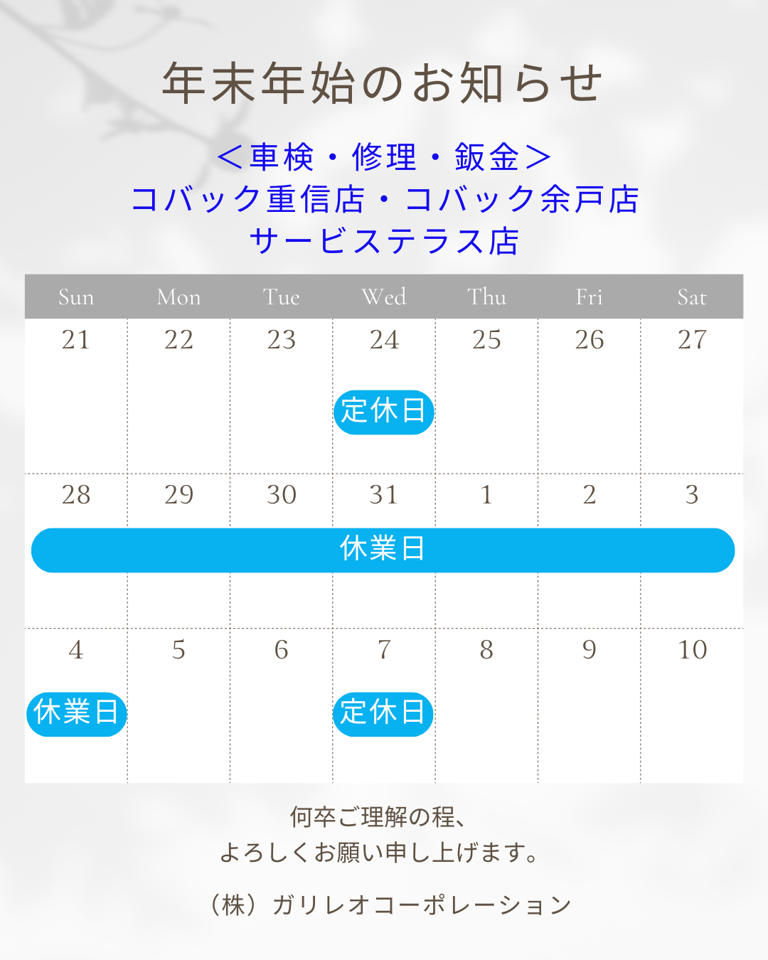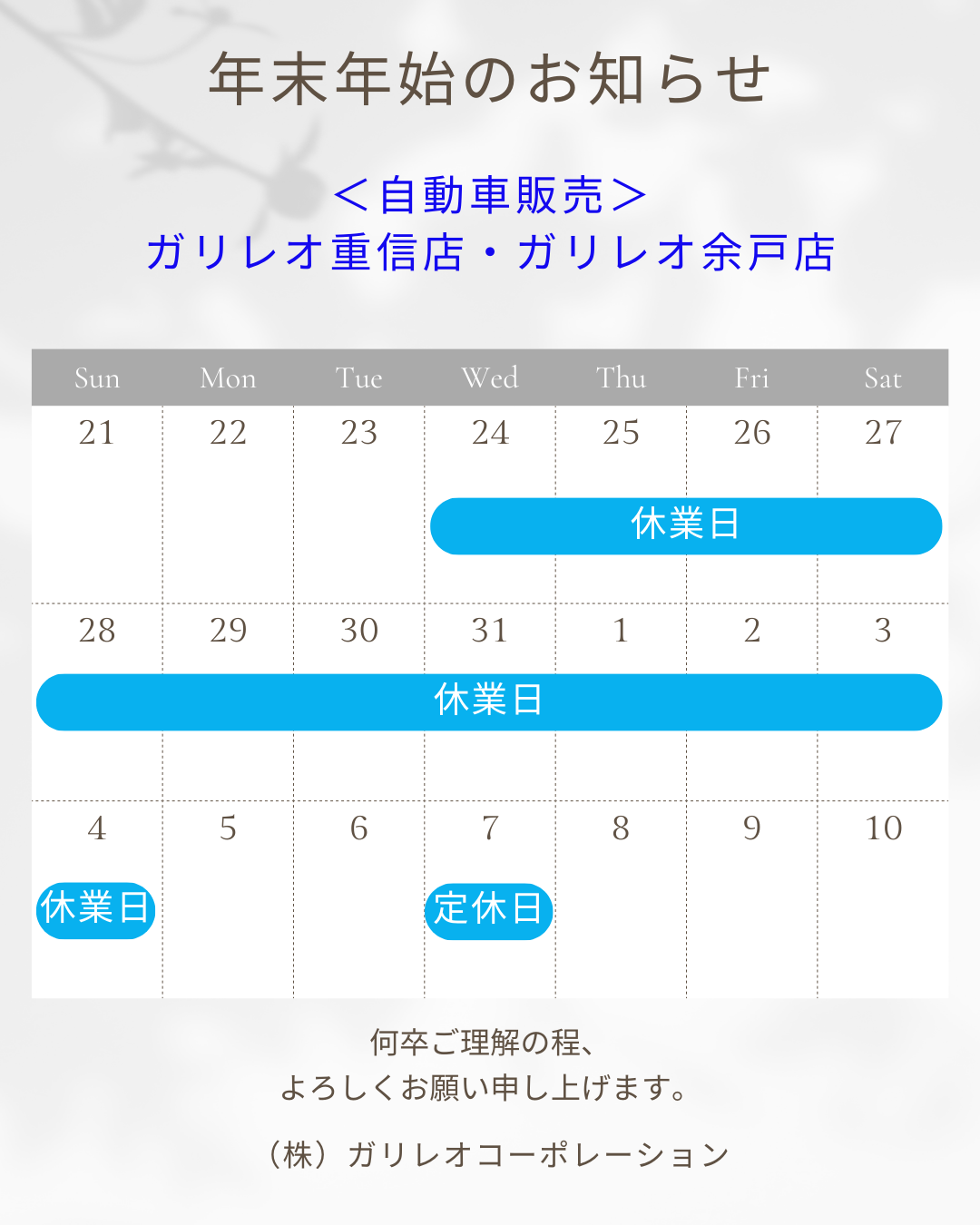 なお、休業期間中の事故・故障につきましては、ガリレオグループで自動車保険にご加入のお客様は、℡0120-024-024(あいあいニッセイ同和損保 事故受付窓口)へご連絡ください。
